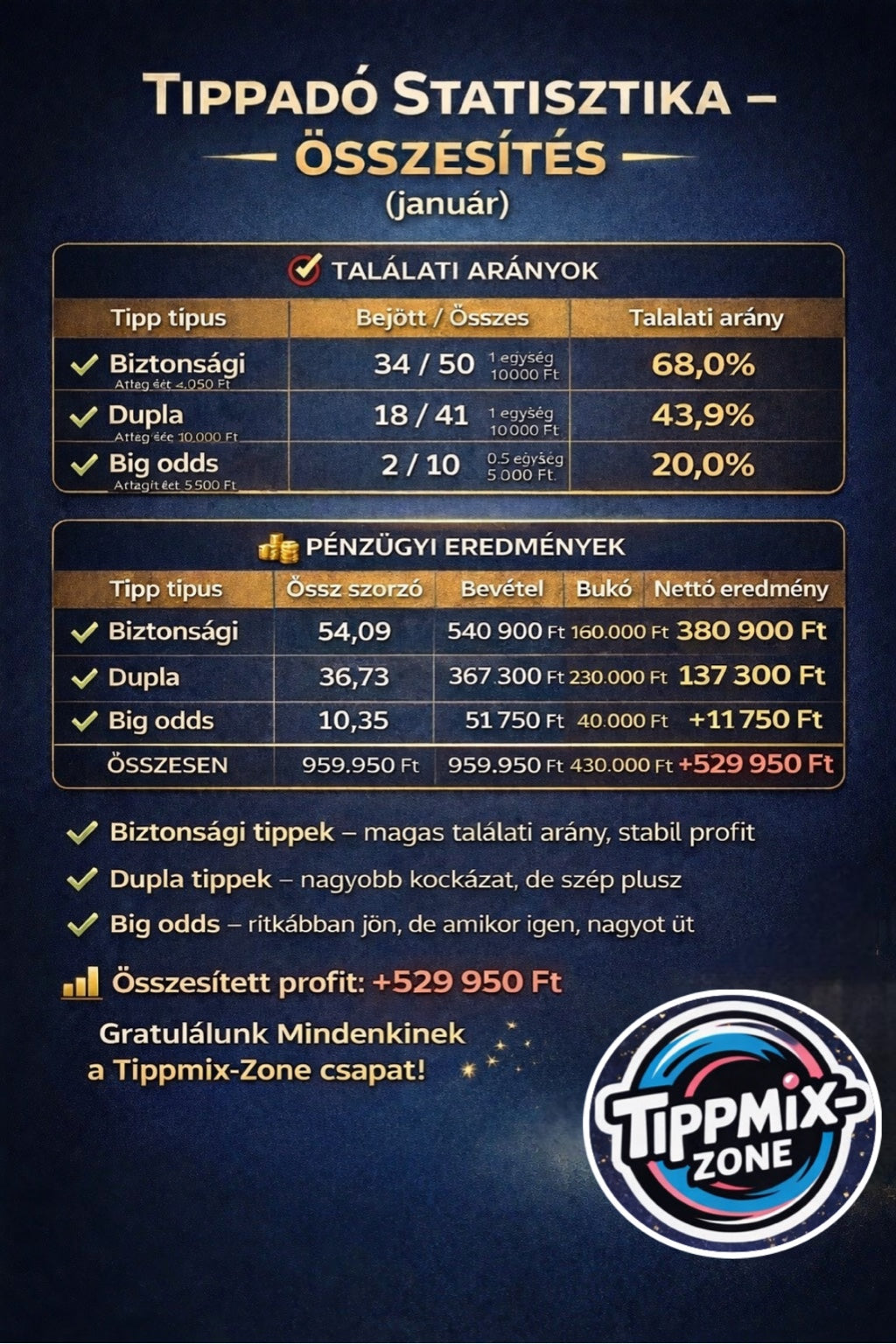 A Tipp-Zone-ban a tippekhez elemzést is kapsz (gólok, hendikep, lapok stb.), plusz bankroll / unit szemléletet.